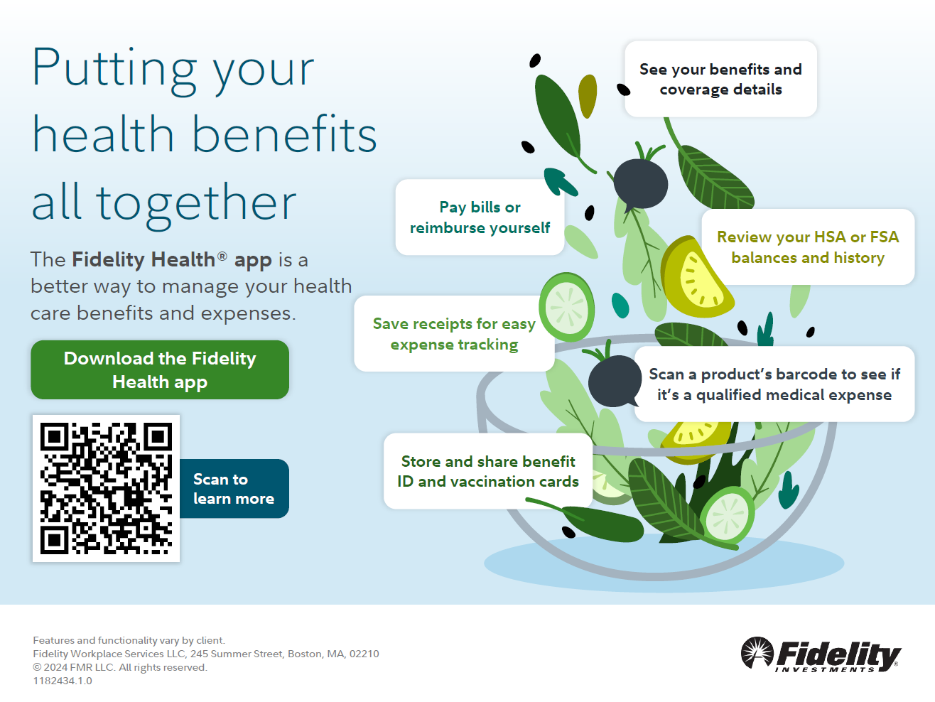 Promotes the Fidelity Health App and encourages app utilization and a place to download.